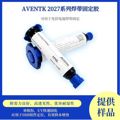 AVENTK 2027系列焊帶保護膠,滿(mǎn)足多種光伏組件電池焊帶固定要求,設計用于PERC或TOPCon焊帶固定,有高透光率以及耐高溫性能,對玻璃以及金屬有優(yōu)異附著(zhù)能力。無(wú)需膜、串焊環(huán)節,無(wú)需增加耗材成本,相對投入較少,可以滿(mǎn)足短時(shí)間技術(shù)更新。 針對光伏電池用膠需求,AVENTK也有一系列UV膠及環(huán)氧膠,可滿(mǎn)足光伏電池及新能源行業(yè)的用膠需求。