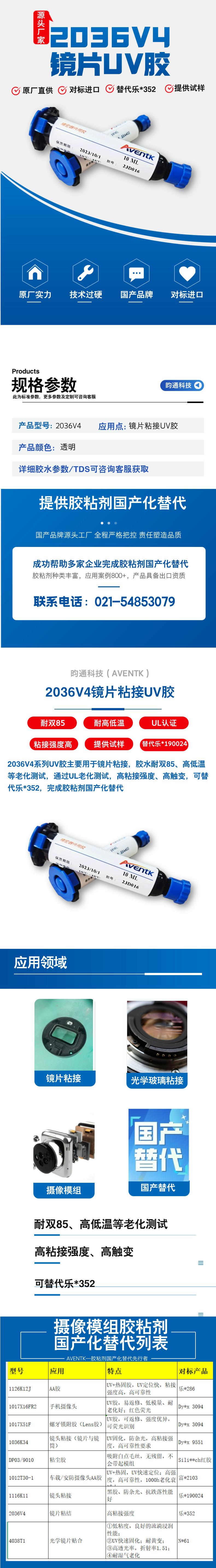 2036V4系列UV膠主要用于鏡片粘接,膠水耐雙85、高低溫等老化測試,通過(guò)UL老化測試,高粘接強度、高觸變,可替代樂(lè )*352,完成膠粘劑國產(chǎn)化替代