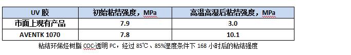 AVENTK 1070具有優(yōu)異的耐高溫高濕性能,實(shí)驗中,將初始粘結好的環(huán)烯烴樹(shù)脂COC-透明PC件,經(jīng)85℃、85%濕度條件下168小時(shí),粘結強度可達到10.1MPa,可滿(mǎn)足高溫高濕測試的要求。