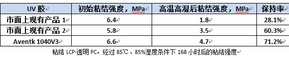 AVENTK 1040V3具有優(yōu)異的初始粘結性能,經(jīng)85℃、85%濕度條件下168小時(shí)后保持率達71.2%,可滿(mǎn)足高溫高濕測試的要求。