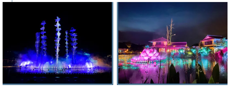 除了美麗的夜景,夜游拈花灣的另一重點(diǎn)就是欣賞那些充滿(mǎn)禪意的表演。包括一葦渡江的水幕電影、五燈湖的花開(kāi)五葉、微笑廣場(chǎng)的拈花一笑、拈花塔的亮塔儀式等。