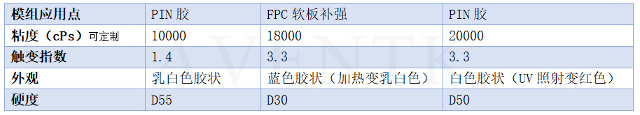 AVENTK 1017X31C系列是用于攝像頭模組FPC/PIN的丙烯酸體系膠水,可通過(guò)UV快速固化,并且達到攝像頭模組軟板補強或封PIN所需的粘接力。